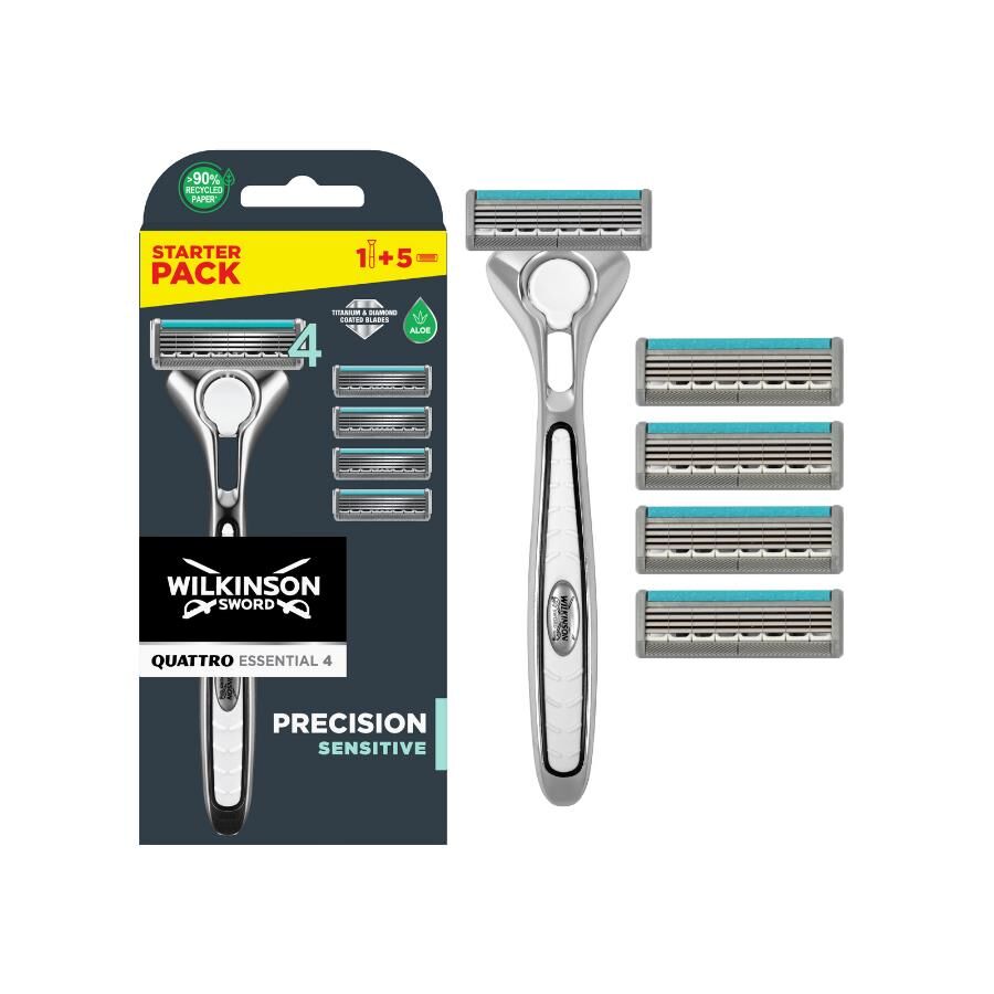 Gelince Haber VerWilkinson Sword Quattro Essential 4 Precision Sensitive, hassas ciltler için geliştirilmiş 4 bıçaklı üstün tıraş teknolojisini ergonomik bir tasarımla sunar. Starter Pack içeriğinde bulunan 1 adet tıraş makinesi sapı ve 5 yedek bıçak, uzun süreli kullanım için ideal bir paket oluşturur.